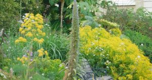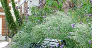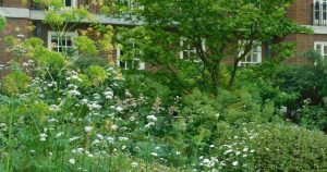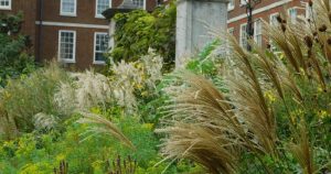 The famous Borders shine from late spring till the end of the year with an exuberant and experimental tapestry. The tapestry mixes woody specimens, perennials, bulbs and annuals. These include dramatic gems such as the Chinese Rice Paper Plant (Tetrapanax papyrifer ‘Rex’), Dahlias (including Tree Dahlia Dahlia imperialis), and Giant Fennels (Ferula communis) weaved with ornamental grasses, salvias, geraniums and self-seeders providing spontaneity. We are working with Pollinating London Together to ensure the planting provides habitat and nectar for pollinators such as wild bee species, moths, butterflies and hoverflies.