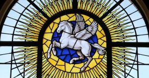 According to one version of the Greek legend, Pegasus, the winged horse, was born from the neck of the gorgon, Medusa, after Perseus had severed her head. Rising heavenward to Helicon, the home of the Muses, he became a symbol of virtue and creative inspiration. The Honourable Society of the Inner Temple reflects the sentiment in its Latin motto, originally Volat alta ad sidera virtus and more recently Volat ad aethera virtus (virtue flies to the heavens).